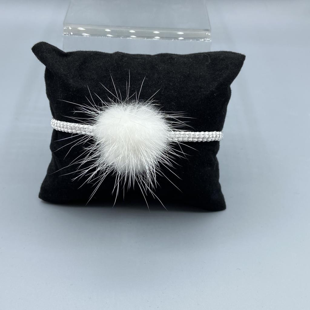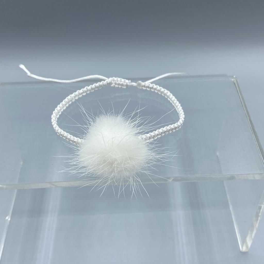 Armband geflochten mit Polyestergarn, weiss, mit echtem Pelzpommel