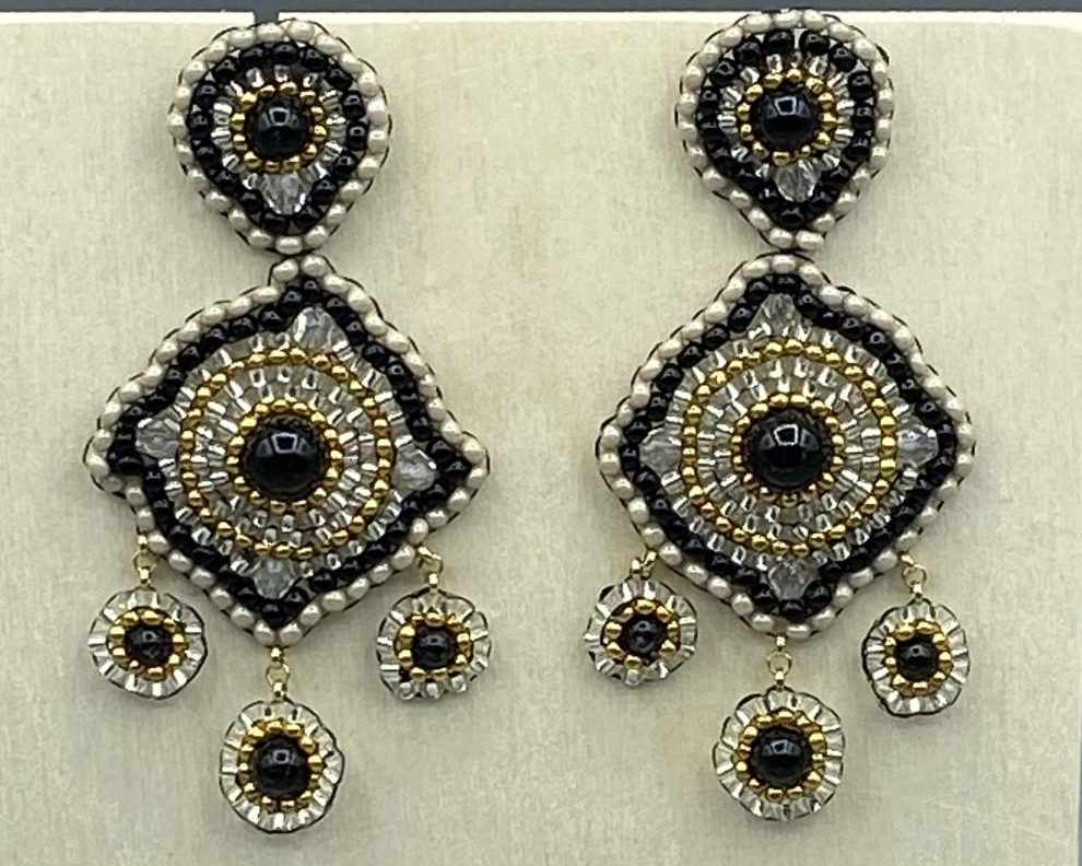 Ohrschmuck mit schwingenden Elementen,  gold, schwarz, kristall und beige, Miyukiperlen,